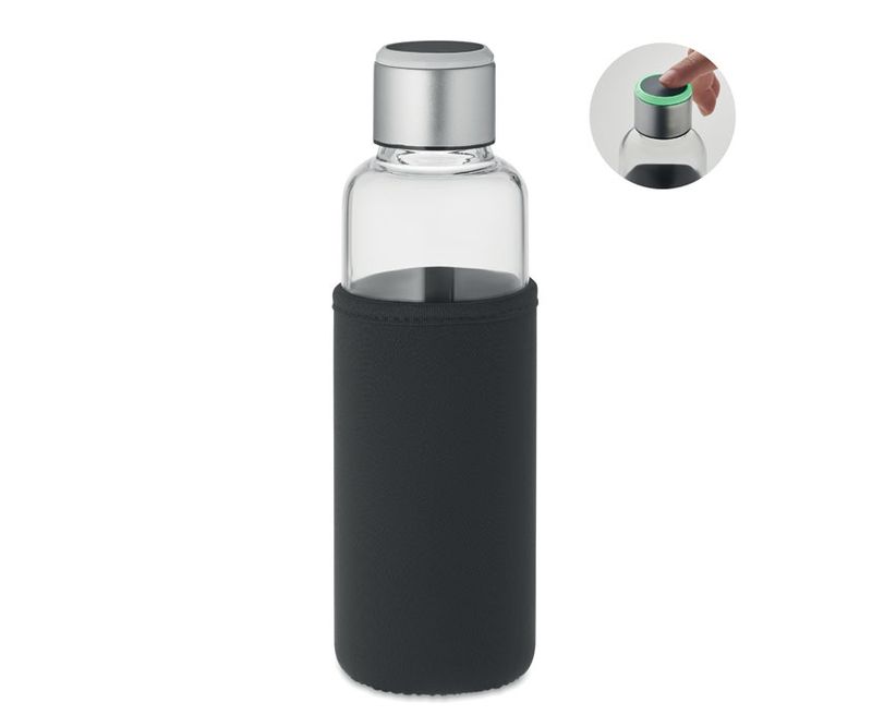 Sticla borosilicata cu memento de hidratare, cu pouch. Lumina senzorului se aprinde la fiecare ora, amintindu-va cand este timpul sa beti apa. Include 1 baterie CR2032. Capacitate: 500 ml.