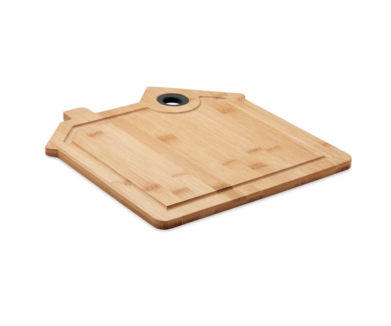 Tocator lemn in forma de casa din bambus cu sant si gaura pentru agatat. Bambusul este un produs natural, in consecinta pot aparea diferente de culoare, dimensiune sau desen.