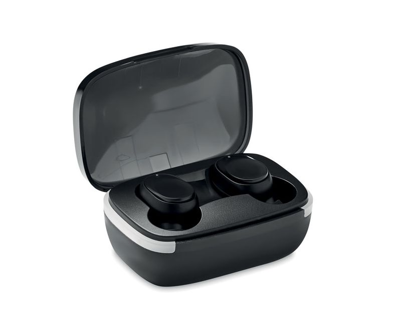Set de 2 casti True Wireless Stereo (TWS) 5.1 cu microfon si baterie de 25 mAh incorporata. Timp de redare de aproximativ 3 ore. Auto- imperechere. Inclusiv un cablu de incarcare micro USB si o statie de incarcare de 200 mAh.