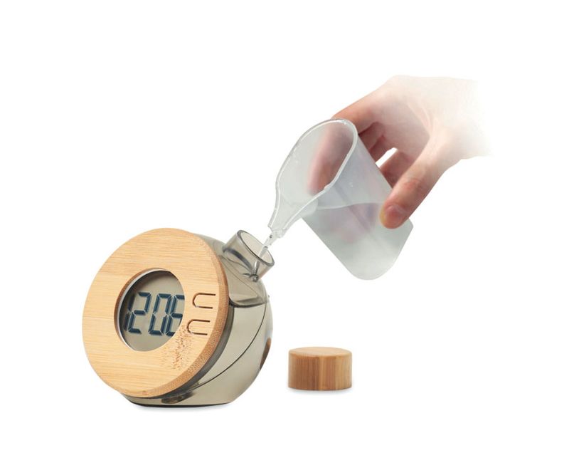 Ceas LCD cu afisaj mare si detalii din bambus. Pentru a alimenta acest produs, adaugati doar apa si 3gr sare. 1 baterie LR41 inclusa pentru memorie. Bambusul este un produs natural, pot exista mici variatii de culoare si dimensiune pentru fiecare articol, care pot afecta rezultatul final al imprimarii.