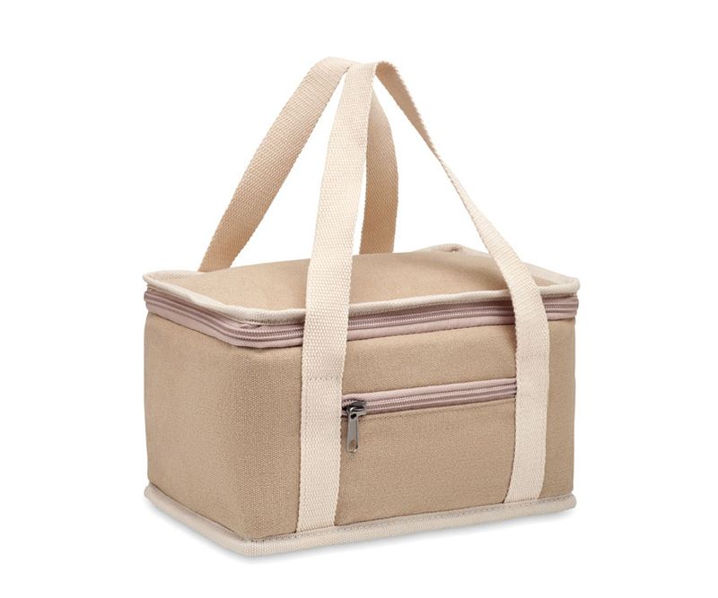 Geanta termorezistenta pentru 6 doze, panza canvas, curea din bumbac. 320 gr/m². Izolatie: PEVA 15C cu spuma PE de 6 mm.