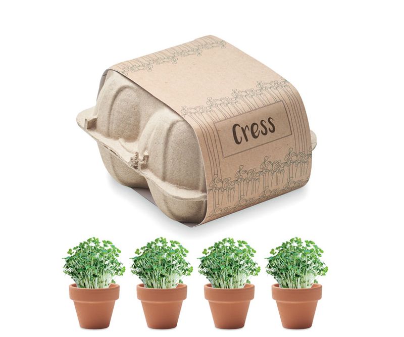Set de 4 ghivece de teracota din lut. Include seminte de creson, prezentate intr-o tava din carton de oua. Fabricat in UE. Compost inclus.