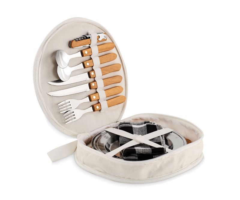 Set de 2 tacamuri de masa pentru picnic. Include furculita, cutit, lingura si desfacator de sticle din otel inoxidabil si bambus. Ambalat in pouch din bumbac. Bambusul este un produs natural, in consecinta pot aparea diferente de culoare, dimensiune sau desen.