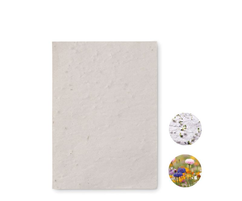 Foaie de hartie reciclata cu seminte de flori salbatice in format A6 (80 gr/m²). Fabricata in UE.
