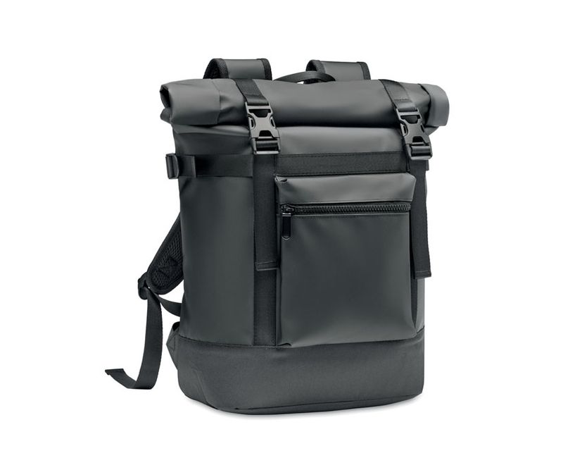 Rucsac rolltop din tarpaulin 50C cu spate, baza si bretele de umar captusite si intarite. Buzunare frontale cu fermoar.