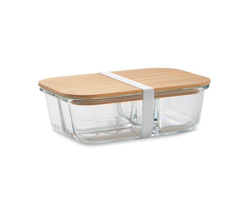 Cutie de pranz din sticla borosilicata cu 3 compartimente, capac din bambus si banda din silicon. Capacitate: 800 ml. Bambusul este un produs natural, in consecinta pot aparea diferente de culoare, dimensiune sau desen. Fara scurgere.
