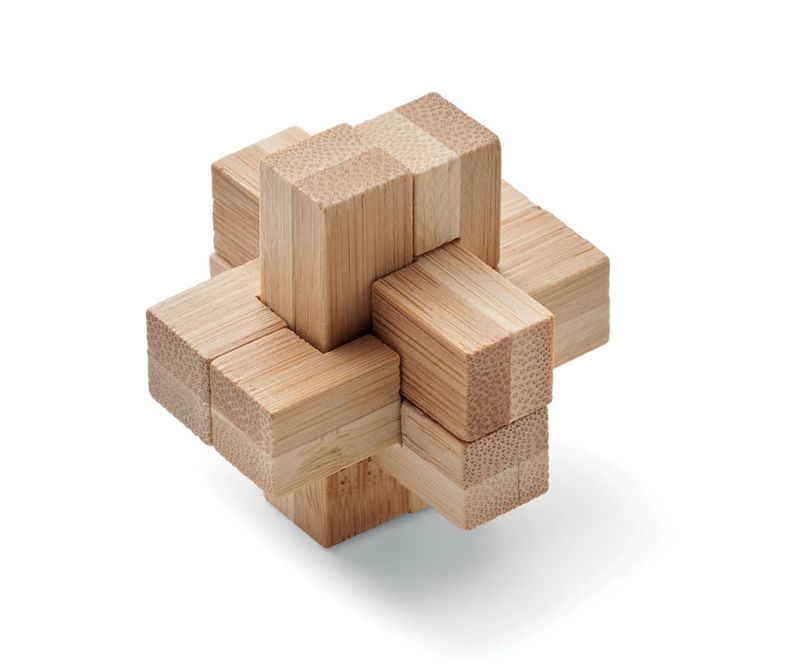Puzzle de bambus cu puzzle de tip brain teaser din bambus. Prezentat intr-o cutie din hartie reciclata. Bambusul este un produs natural, in consecinta pot aparea diferente de culoare, dimensiune sau desen. Fara scurgere.