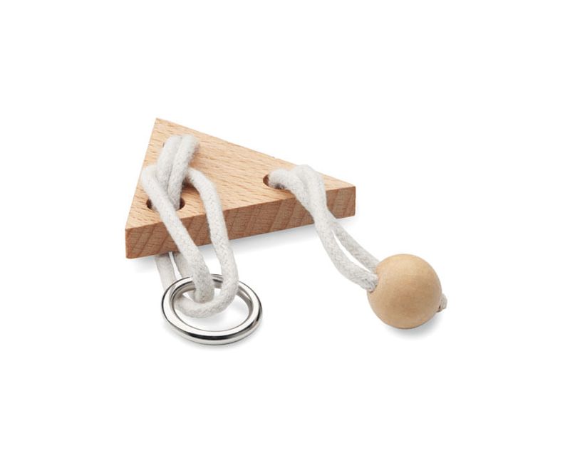 Puzzle din lemn brain teaser in forma de triunghi. Ambalat intr-o cutie din hartie reciclata. Lemnul este un produs natural, in consecinta pot aparea diferente de culoare, dimensiune sau la personalizare.