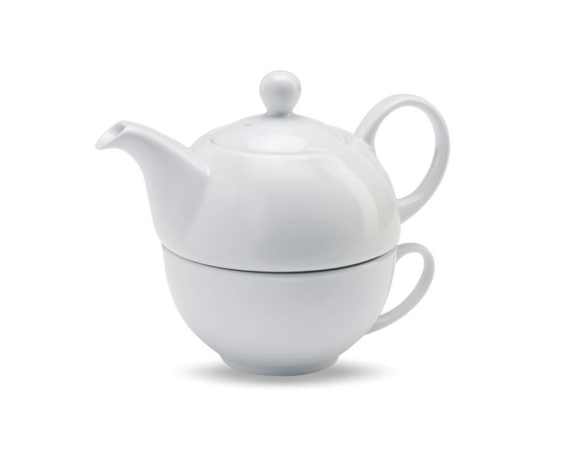 Set de ceai care include un ceainic de 400ml si o ceasca din ceramica alba. Prezentat intr-o cutie individuala neagra.