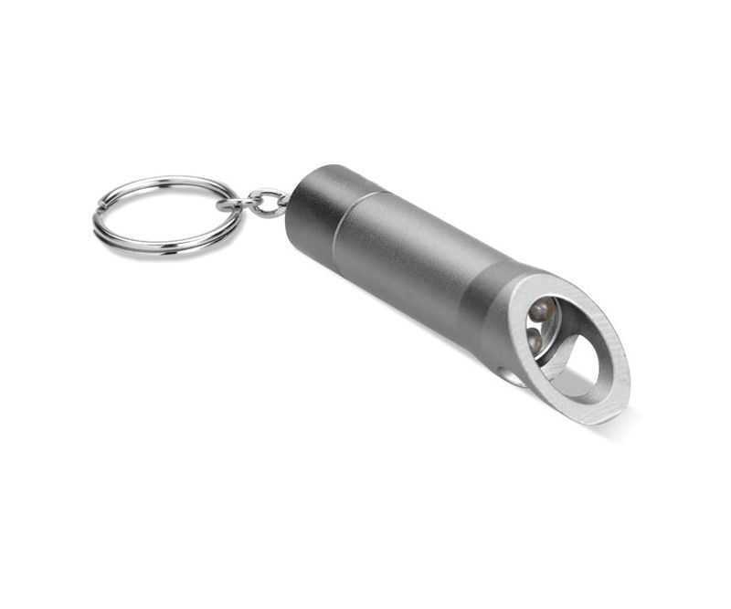 Breloc metalic cu LED si desfacator de sticle. Include baterie.