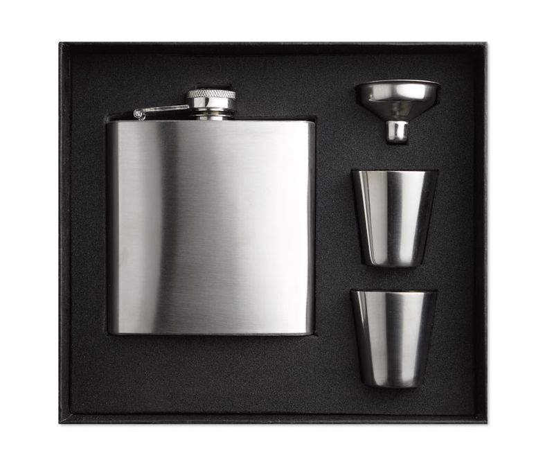 Plosca metalica cu finisare satinata, perete simplu, 175 ml, cu 2 paharele si dop. Ambalate in cutie neagra.