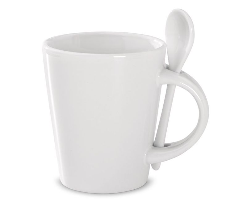 Cana din ceramica, cu lingurita si finisare speciala pentru personalizare prin sublimare. 300 ml. Ambalare individuala in cutie alba din carton.