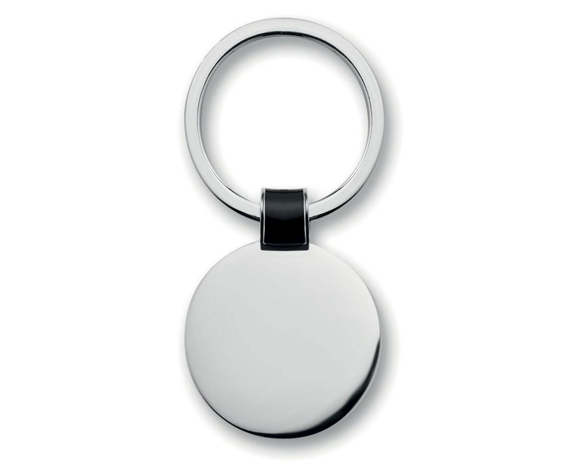 Breloc metalic cu finisare nichelată, în formă rotundă.