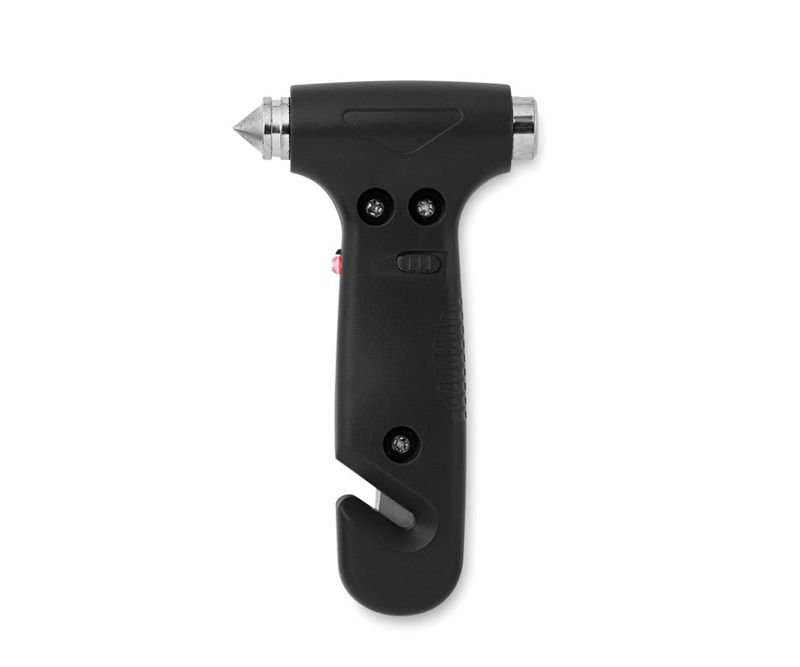 Ciocan de urgenta 3 in 1 din plastic ABS, cu taietor pentru centura de siguranta si lumina LED. 3 baterii de tip AG3 nu sunt incluse.