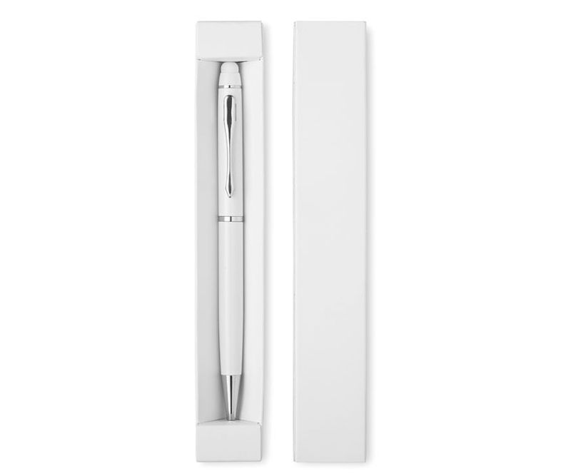 Pix din aluminiu cu deschidere prin rasucire, mina albastra si capat moale pentru ecran LCD. Ambalat in cutie din hartie.