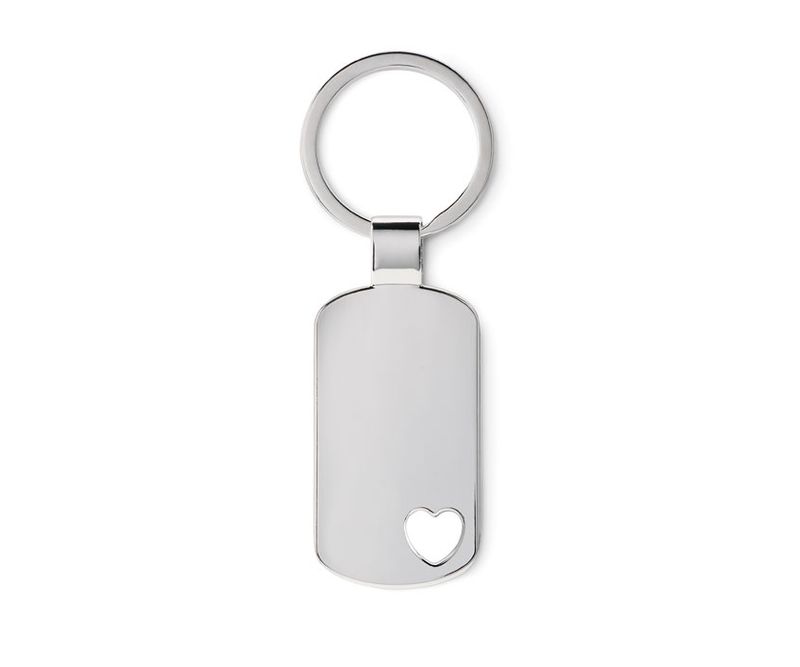 Breloc metalic cu inimă în capăt, ambalat individual în cutie.