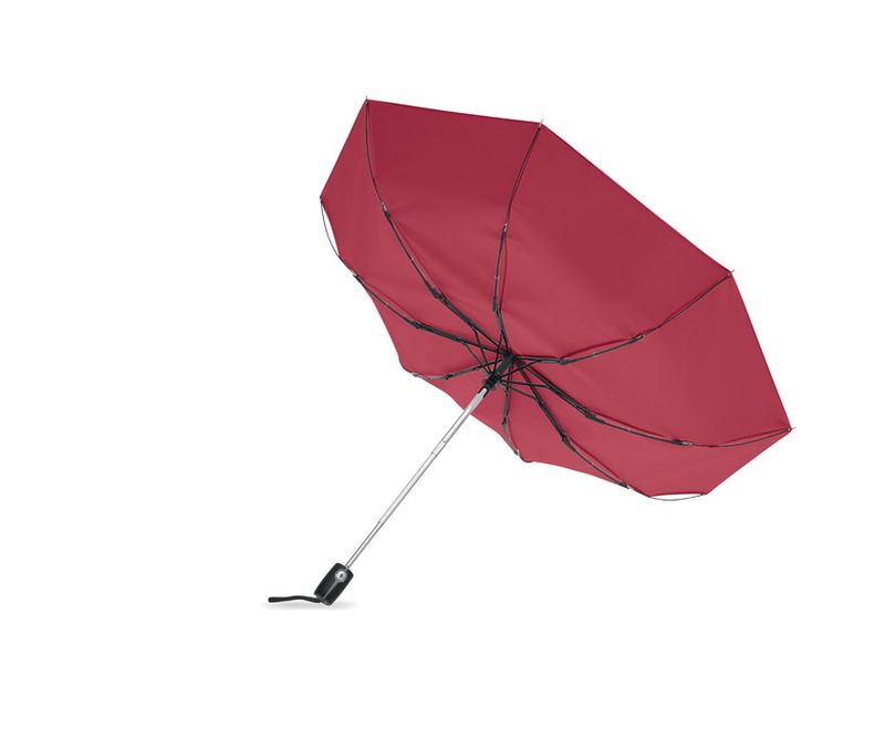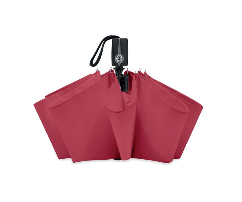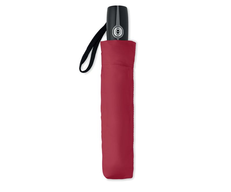 Umbrela de lux cu deschidere automata, 21 inchi, poliester satinat 190T, ax metalic zincat, spite negre cu fribra de sticla in 2 sectiuni, terminatii metalice cromate, maner negru cauciucat cu eticheta epoxidica. Husa asortata. Inchidere automata in 3 sectiuni.