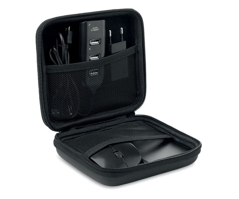 Set accesorii pentru calculator in husa imitatie piele / EVA, ce include 1 mouse fara fir, 1 extensie USB 2.0 cu 4 intrari, 1 stecher compatibil UE, 1 baterie externa de 4000 mAh. Inclus cablu micro USB.