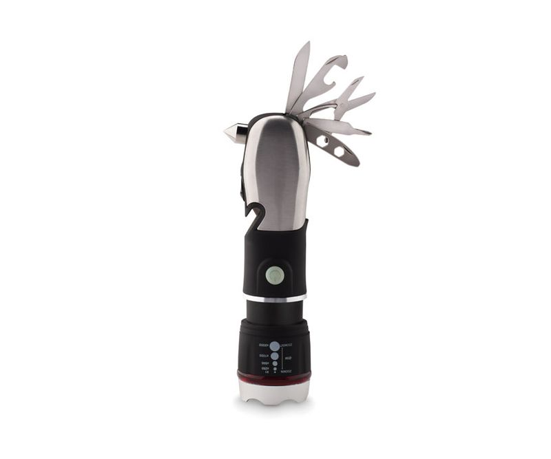 Lanternă cu 9 funcții, ciocan de siguranță și cuțit, din plastic, cu finisaj cauciucat. 3 grade de intensitate lumină, cu funcție de apropiere. Funcționează cu 3 baterii tip AAA, neincluse.