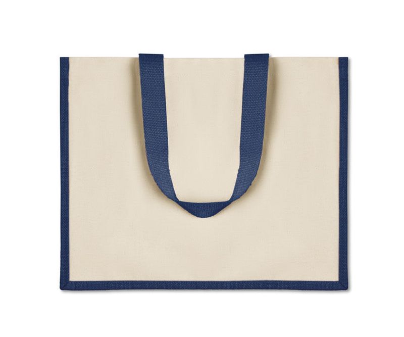 Sacosa pentru cumparaturi din iuta laminata, cu manere lungi si panza pe fata. Acest produs este certificat OEKO-TEX® STANDARD 100.