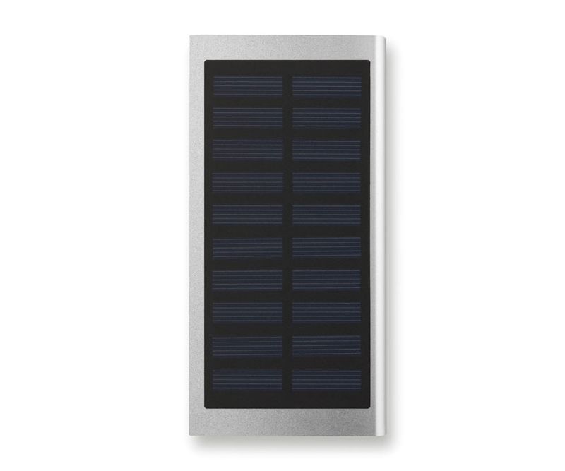 Baterie externa solara de 8000 mAh, din aluminiu reciclat, cu panel solar. Compatibil cu telefon, curent iesire DC5V/1A si DC5V/2A. Prevazut cu indicator de lumina si cablu USB cu micro-USB.