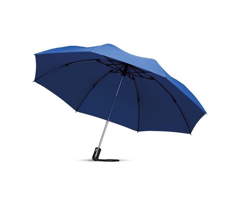 Umbrela reversibila 23”, cu inchidere/deschidere automata, pliabila in 3 sectiuni, poliester fin 190T, ax metalic cromat, spite din fibra de sticla, maner negru din plastic, cu buton, husa asortata.