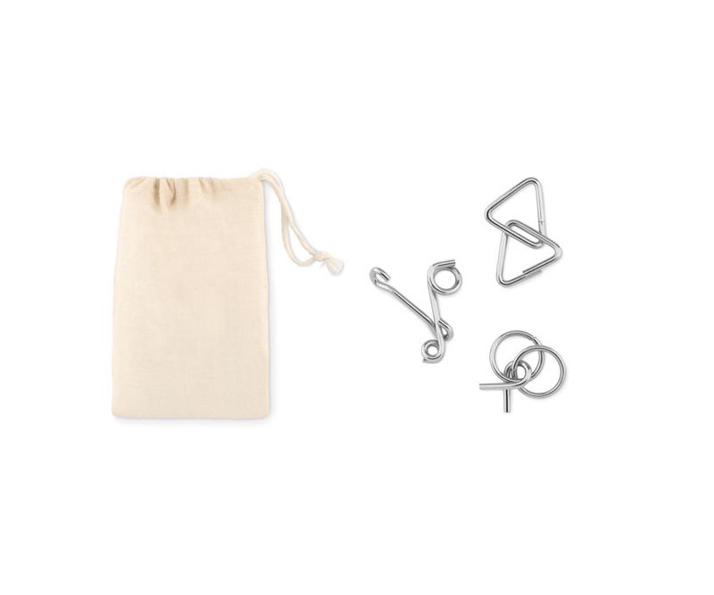 Joc de inteligenta cu 3 piese metalice, ambalat in husa din bumbac.