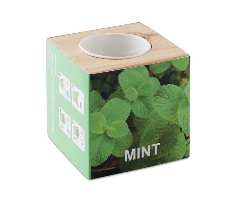 Ghiveci in carcasa din lemn. Seminte de menta. Compost inclus.