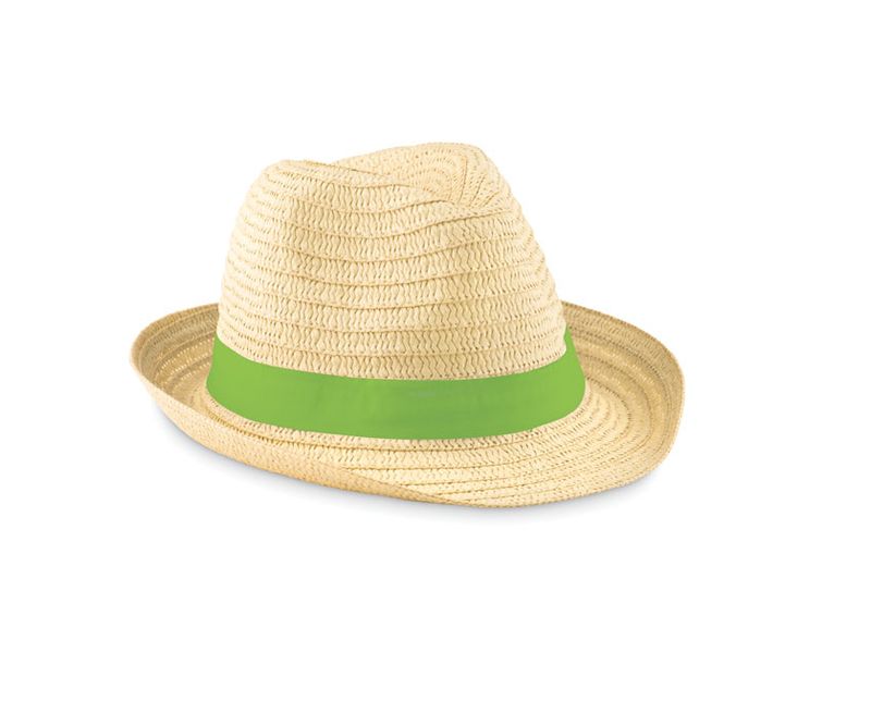 Palarie din paie cu panglica colorata din poliester. Pentru comenzile neimprimate benzile colorate se livreaza separat, nu sunt atasate la palarii.