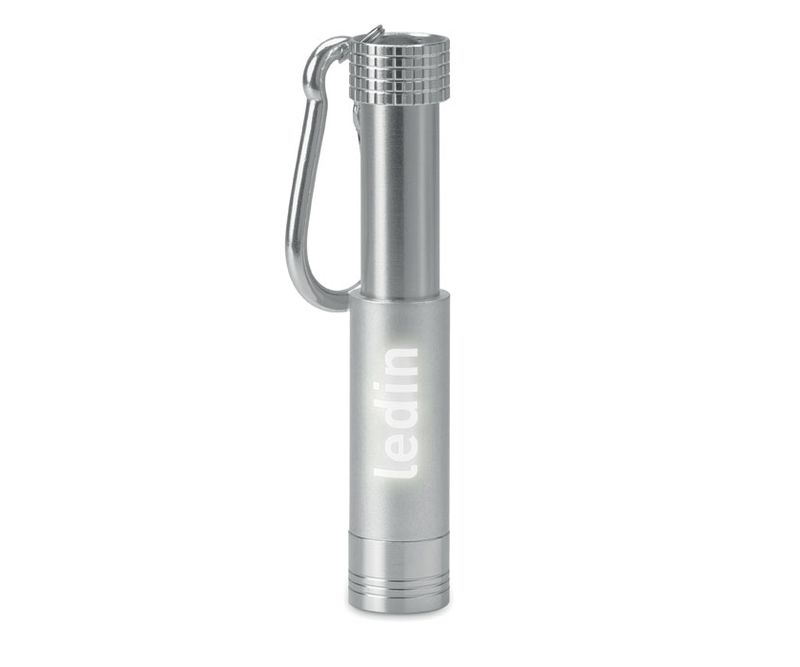 Breloc din aluminiu și ABS cu lanternă. Se personalizează prin gravură și va permite luminarea logoului. Include 4 baterii tip LR44 .