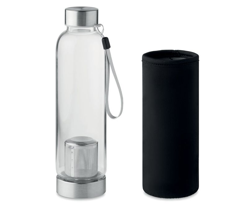 Sticla de baut, cu perete simplu din borosolicat, cu strecurator pentru ceai si husa din neopren. Capacitate: 500 ml. Nu este recomandata pentru bauturile carbogazoase. Fara scurgere. Gravarea cu laser nu este posibila pe sticla borosilicata.