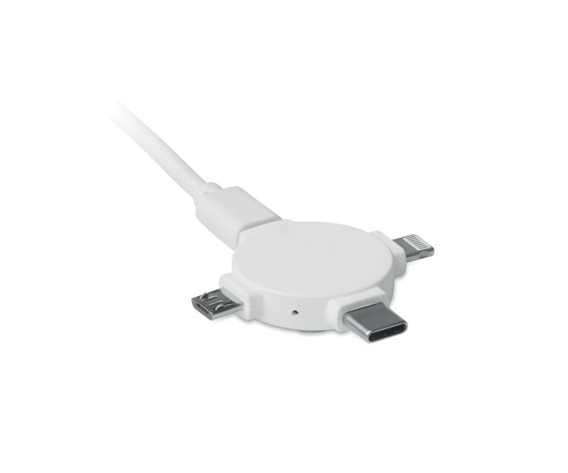 Cablu de incarcare 3 in 1, cu 3 diferite tipori de mufe, micro-USB, tip C si conector cu doua laturi. Adaptabil pentru dispozitive iOS si Android. Ideal pentru personalizare full color.