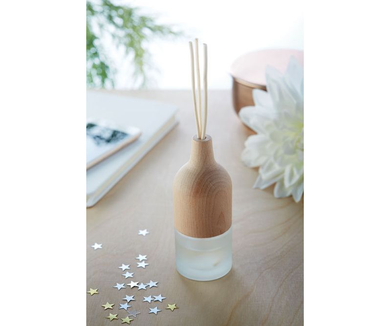 Difuzor de aroma cu 3 betisoare din lemn de fag. Partea superioara din fag si sticla. Arome de crin. Capacitate de 30 ml. Cum lemnul este un material natural, culoarea pe item poate varia. Partea superioara din lemn absoarbe uleiul si ajuta la evaporarea parfumului.