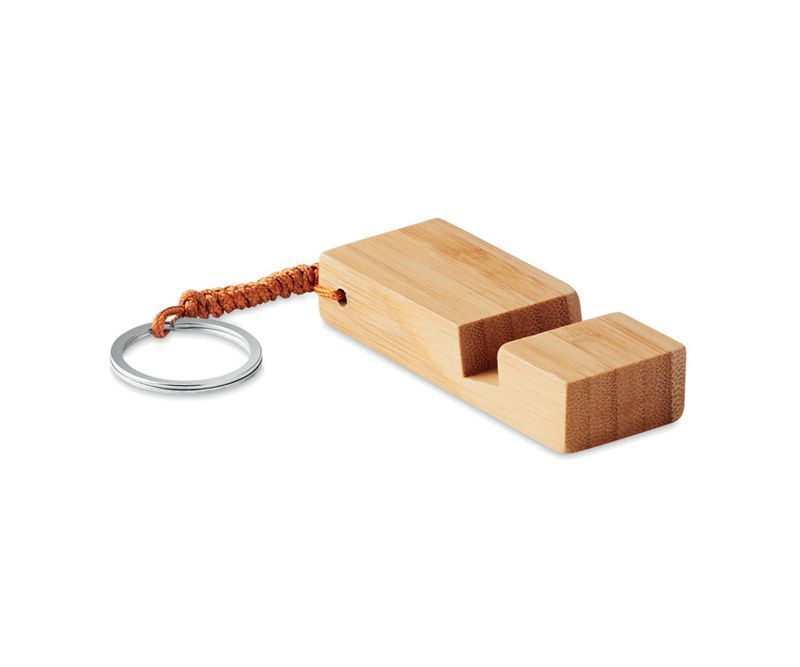 Breloc cu stativ pentru smartphone din bambus. Bambusul este un produs natural, în consecință pot apărea diferențe de culoare, dimensiune sau desen.