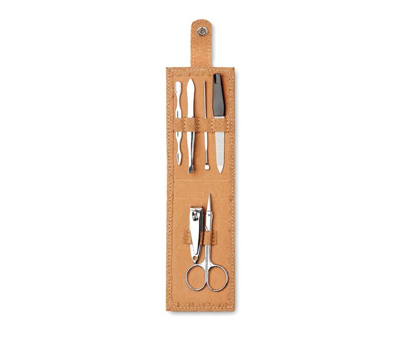 Set manichiura in husa dreptunghiulara din pluta. Toate cele 6 piese sunt din inox. Pluta este un material natural, avand in vedere structura si suprafata poroasa, printul pe anumite produse poate fi diferita.