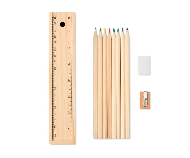 Set de 12 piese de creioane. (2 creioane/6 culori de creioane/1 ascutitoare/1 radiera, rigla care este si capacul cutiei de lemn).
