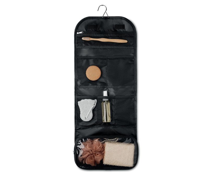 Geanta pentru accesorii de voiaj din poliester 600D si 300D - geanta cu compartimente din plasa si compartiment suplimentar PEVA.