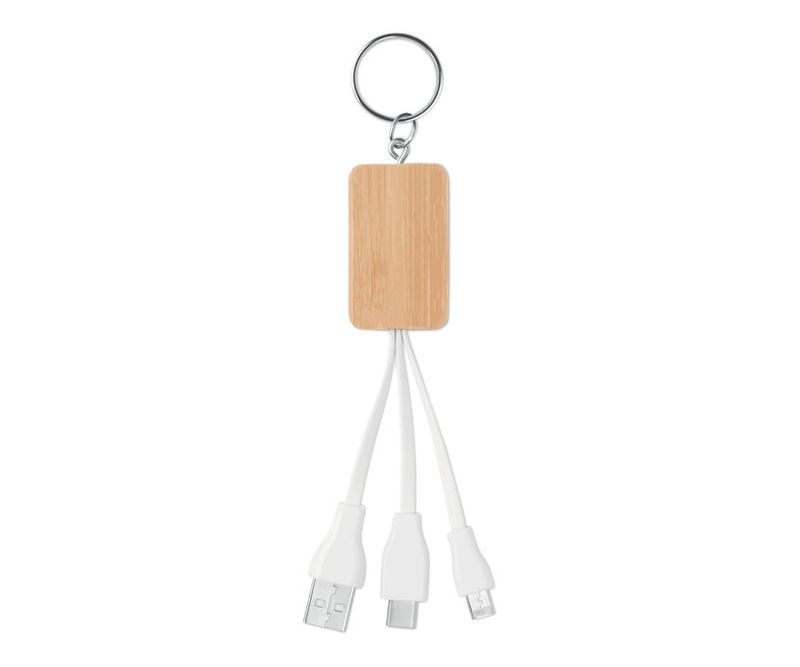 Breloc cu carcasa de bambus cu cablu de incarcare USB-A pana la Micro-B (mufa 2 in 1) si tip C. Bambusul este un produs natural, in consecinta pot aparea diferente de culoare, dimensiune sau desen.