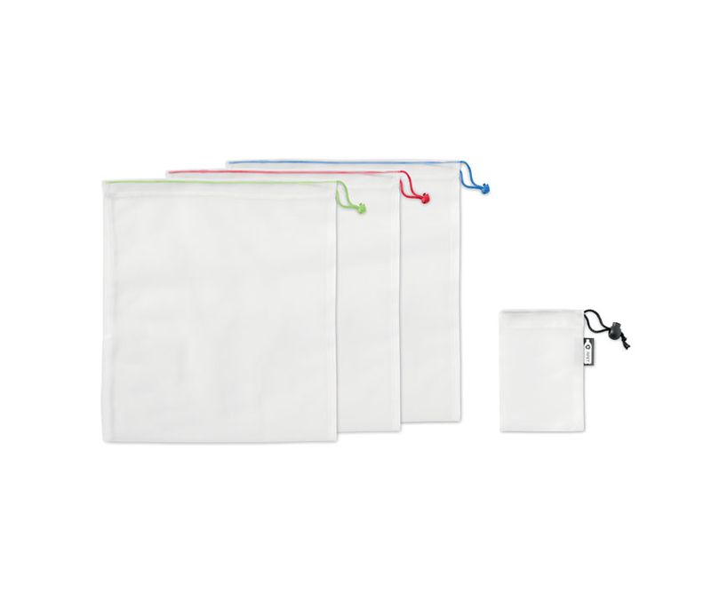 Set de 3 pungi cu plasa RPET in husa RPET. Saci reutilizabili pt fructe sau legume, ca alternativa la pungile de cumparaturi din plastic. Inchidere cu cordon. Se poate spala la masina, fara BPA si siguranta alimentara.