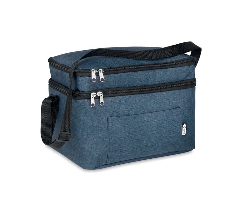 Geanta racire, in 2 culori 600D RPET cu 2 compartimente. Curea de umar reglabila si buzunar frontal. Material de izolare: 0,15 mm PEVA + 3 mm spuma.