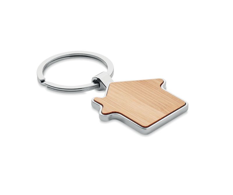 Breloc cu formă de casă, din aliaj de zinc cu față din bambus. Bambusul este un produs natural, astfel pot apărea diferențe la personalizare.
