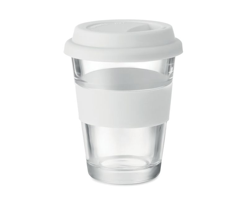 Pahar de sticla cu capac si prindere din silicon. Capacitate 350 ml. Intrucat acesta este un pahar cu un singur perete poate pierde caldura.
