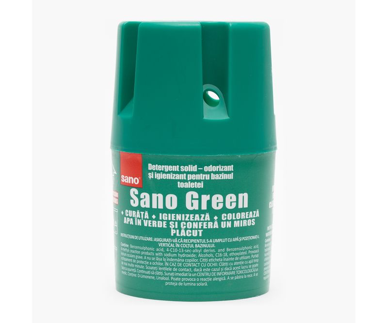 Sano Green se poziționează vertical în rezervorul cu apă și asigură curățenie, parfum și culoare plăcută în apă. Formula sa neutralizează mirosurile neplăcute și oferă strălucire vasului de toaletă, menținând toaleta igienizată și proaspătă.