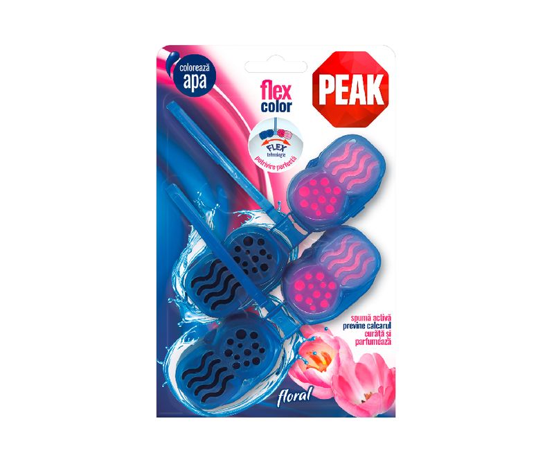 Peak Flex Color Floral oferă o soluție completă pentru menținerea toaletei curate și parfumate. Cu tehnologia Flex, se potrivește perfect pe vasul de toaletă, colorează apa albastru, curăță eficient, parfumează delicat și previne depunerile de calcar.