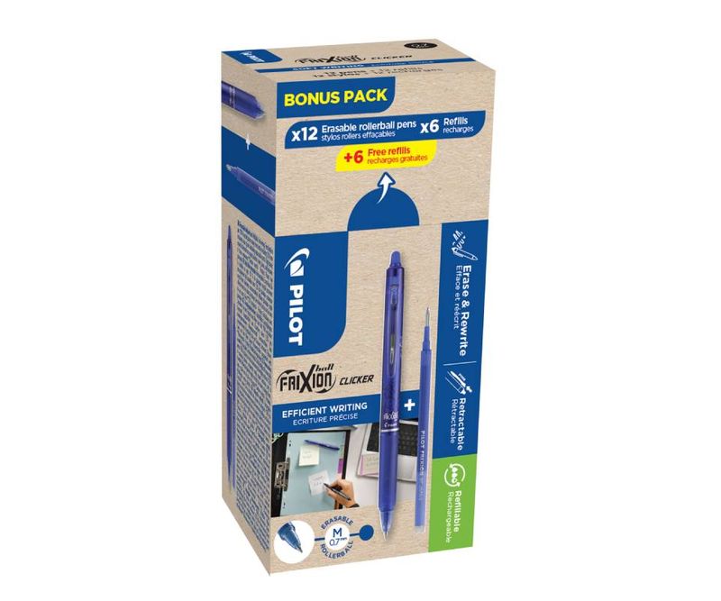 Scrie… şterge… rescrie cu FriXion în versiune retractabilă! Şterge curat, fără a lăsa urme folosind radiera care prin frecare generează căldură. Utilizează aceaşi cerneală pentru a scrie şi rescrie. Folosind o nouă cerneală, patentată de PILOT, FriXion Ball Clicker continuă tradiţia de a revoluţiona scrisul. Un stil tânăr, un corp tatuat şi 7 culori incredibile definesc pixul care a cucerit lumea. A nu se folosi pentru semnături sau scrierea pe documente legale, pe colile de examen sau alte documente unde este necesară folosirea cernelei permanente.