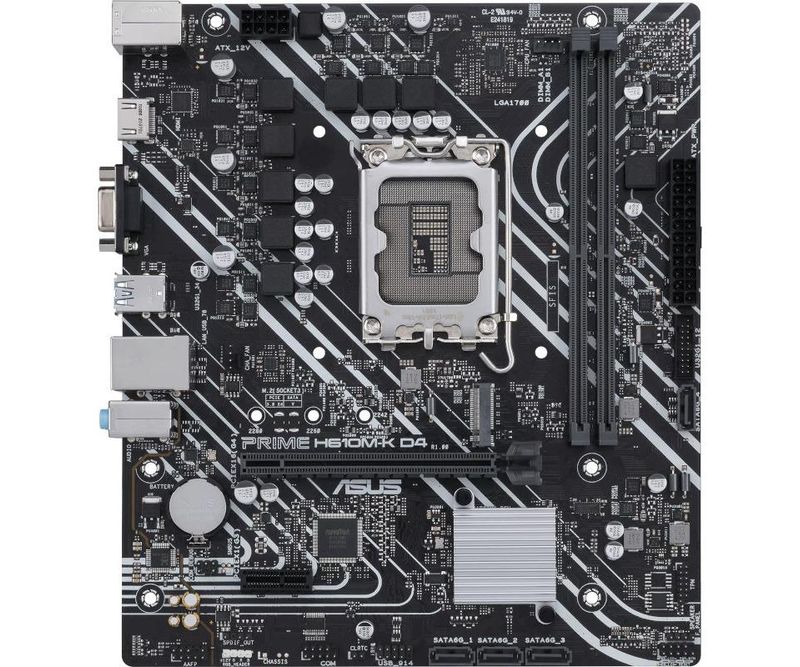 Placa de baza Asus PRIME H610M-K D4 LGA 1700 Intel® H610 (LGA 1700) mic-ATX motherboard with DDR4, PCIe 4.0, M.2 slot, Realtek 1 Gb Ethernet, HDMI®, D-Sub, USB 3.2 Gen 1 ports, SATA 6 Gbps, COM header, RGB header Intel® LGA 1700 socket: Ready for 12th Gen Intel® processors Comprehensive cooling: PCH heatsink and Fan Xpert Ultrafast connectivity: 32Gbps M.2 slot, Realtek 1 Gb Ethernet and USB 3.2 Gen 1 support 5X Protection III: Multiple hardware safeguards for all-round protection https://www.asus.com/Motherboards-Components/Motherboards/PRIME/PRIME- H610M-K-D4/