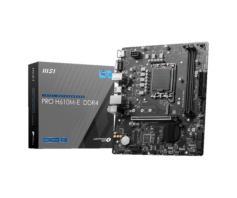 Placa de baza MSI PRO H610M-E LGA1700 DDR4 SPECIFICATIONS Model Name PRO H610M-E DDR4 CPU Support Supports 12th/ 13th Gen Intel® Core™ Processors, Pentium® Gold and Celeron® Processors CPU Socket LGA 1700 Chipset Intel® H610 Chipset Graphics Interface 1x PCIe 4.0 x16 slot Display Interface Support 4K@60Hz as specified in HDMI 1.4, VGA – Requires Processor Graphics Memory Support 2 DIMMs, Dual Channel DDR4-3200 MHz (MAX) Expansion Slots 1x PCIe 3.0 x1 slot Storage 1x M.2 Gen3 x4 32Gbps slot, 4x SATA 6Gbps ports USB ports 4x USB 3.2 Gen 1 5Gbps (4 Type-A) 8x USB 2.0 LAN Realtek® RTL8111H Gigabit LAN Audio 8-Channel (7.1) HD Audio with Audio Boost