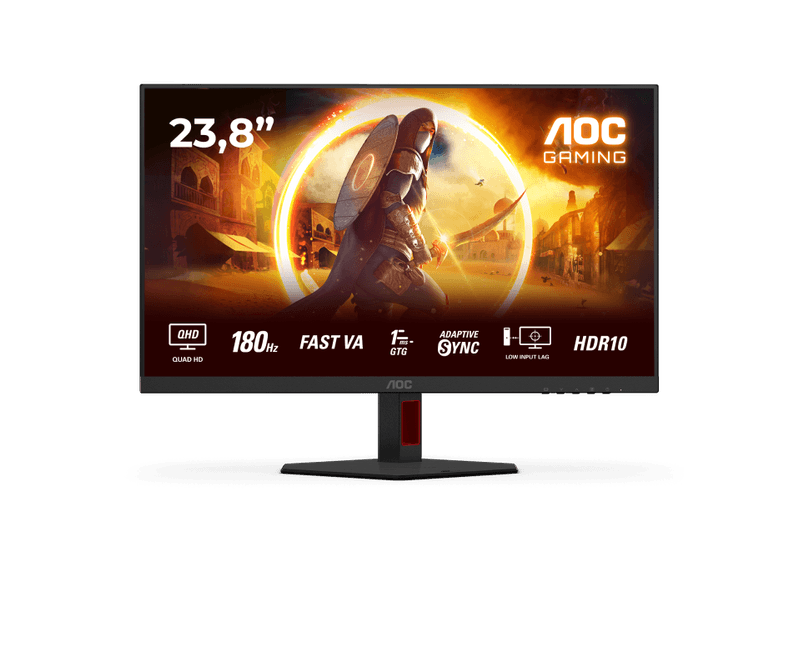 Monitor AOC 23.8 Q24G4RE, Diagonal (inch): 23.8, Diagonal (cm): 60, Aspect ratio: 16:9, Panel: IPS, Resolution: 2560x1440, Refresh Rate: 180Hz, Response time GtG: 1ms, Response time MPRT: 0.5ms, Brightness (max): 300 cd/m², Contrast (static) : 1000:1, Viewing angle: 178/178, Color Gamut Type: DCI-P3, Color Gamut Coverage: 93.7%, Colours: 16.7M, VESA Wallmount: 100x100, Tilt: -5/+23, D-SUB: 0, HDMI: x1, DisplayPort: x1, AUX: x1 3.5mm Audio OUT