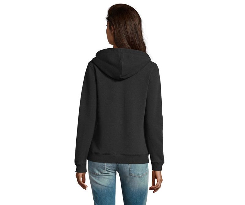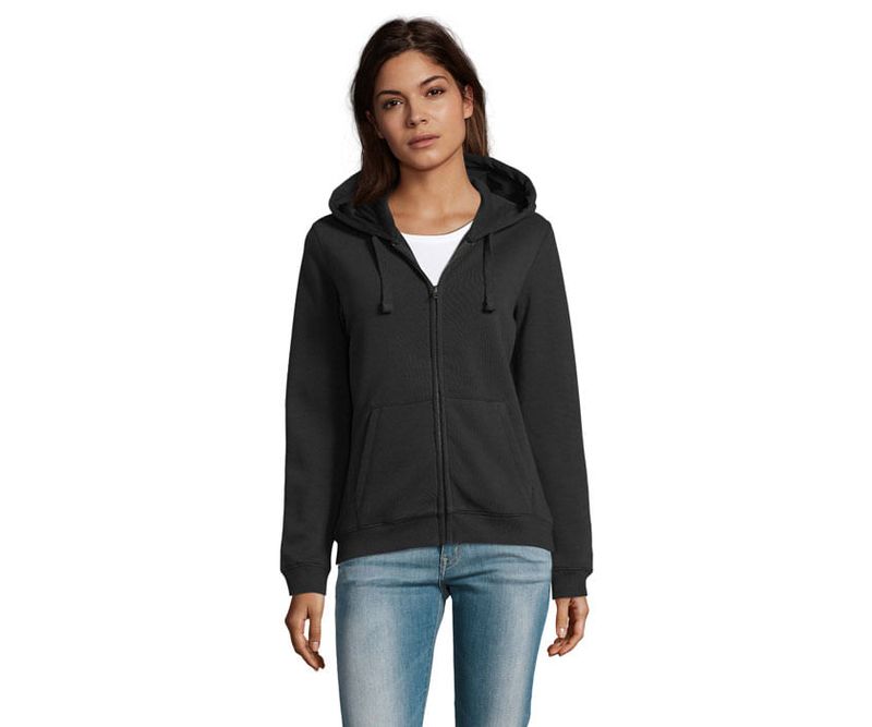 SOL'S SPIKE FEMEI. Hanorac cu gluga si fermoar pentru femei, 80% bumbac inelar filat - 20% poliester Captuseala periat, Exterior: 100% bumbac FLEECE 280 LSF (Low Shrinkage Fabric), Maneci cu fermoar, 2 buzunare fata, Taiate si cusute, Gluga captusita cu cordon de tragere ton pe ton, mansete si tiv cu nervuri 2x2. Guler interior in forma de semiluna, Gat cu banda adeziva, fermoar YKK. OEKO-TEX®. Vandut doar cu personalizare.