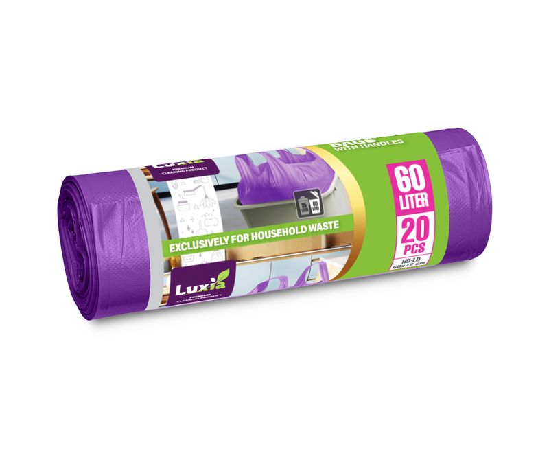 Saci menajeri Luxia 60L cu manere – 20 bucăți/rola, mov (HD-LD)Facilitează curățenia și organizarea cu sacii menajeri Luxia, proiectați pentru a combina rezistența cu ușurința în utilizare. Ideali pentru casă, birou sau orice activitate menajeră, acești saci fac treaba mai simplă și mai sigură.